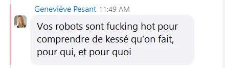 Je vous le dis, j'en avais des pétillements dans tout le corps quand je discute avec vos robots. Comme s'ils étaient directement dans mon cerveau. Je suis tellement contente d'avoir travailler avec vous. Ça ne sera pas la dernière fois.